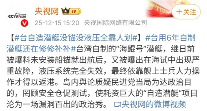 岛内舆论质疑民进党当局为达政治目的,罔顾安全仓促测试,使耗资巨大的“自造潜艇”项目沦为一场漏洞百出的政治秀。